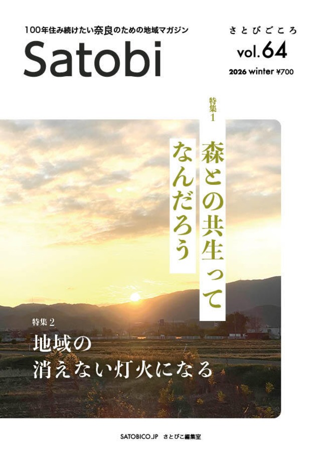 さとびごころvol.64 (2026 winter) A4 フルカラー 28P 特集1 森との共生ってなんだろう 特集2 地域の消えない灯火になる 2026年最初のさとびは、初めて特集を2本建てにしました。 特集1 森との共生ってなんだろう https://satobico.jp/archives/7390 最近、森と共生する社会という言葉をよく耳にするのですが、何をもって共生なのか?という素朴な問いを、今回は二人の方に問いかけてみたのです。ありがたいことに、さとびのサポーターになってくださるような方の中には、読者のみなさんに紹介したいような方が多く、今回もそんな方の中からお願いしました。読者のみなさんの考える材料にしていただければ幸いです。 一人目は、奈良県フォレスターアカデミー校長の藤平拓志さん。県庁職員の専門職です(&さとびのサポーターさま)。アカデミーの理念として「森と共生する社会」があります。その藤平さんにとっての共生とは?という問いの答えは、まず生物学的な共生の定義の確認から始まりました。藤平校長先生が長年の経験から考える「こうでありたい共生」とはをご紹介します。 もう一人は、さとびでお馴染みの連載ライター、谷茂則さんです。 今年の春か、初夏、谷さんの所有林、陽楽の森(奈良県王寺町から上牧町にかけての元薪炭林)にあらたな拠点としてカフェ棟ができる予定です。 奈良県有数の山林所有者の家を継承した谷さんが、これからの林業をどうしたらいいのか悩み、探し、いきついた結果(過程でもあるかも)としての考えを知っていただけたらということです。それは「あらゆる人と森の関係性をひとつでも多く積み上げていく」という方向性でした。 特集 2 地域の消えない灯火になる https://satobico.jp/archives/7423 あまり知られていない小さな地区で始まったひとつのプロジェクトを通して、自然豊かな地域の難しい「課題」と、そこに生まれつつある「希望」の片鱗をたどってみたいと思います。志だけでは行き詰まりがちなヴィジョンの実現を、経営の要素を取り入れ、二本建てによって、現実的にチャレンジしている二人組の物語です。 今回の舞台は、大淀町にある越部地区となります。越部出身の樋口進也さんが、ビジネスの必要性から戻ってきたふるさとは、子供のころとはすっかり姿を変えていました。川の美しさや農業の営みが薄れ、このままでは消滅するのでは…というところまできてたそうです。樋口さんのビジネスパートナーである横山照朗さんは鎌倉生まれ、横浜で経営されている会社の業務を通じて樋口さんとの出会いがあり、ともに始めたビジネスの必要性からこの地区へやってきました。活動を始めるうちに、「ここには全てがある」と直感されたんだそうです。そんな二人が、この地域の消えない灯火になるための活動を始められたいきさつや現在形を取材させていただきました。 その他、人気の連載も、お楽しみください。 目次 4 特集1 森との共生ってなんだろう ・ 05 森林・林業分野を専門的に担当した経験から… 文 藤平拓志(奈良県フォレスターアカデミー校長) ・ 08 人と森の関係性をひとつでも多く 文 谷茂則(谷林業株式会社代表・一般社団法人大和森林管理協会理事長) ・ 10 特集2 地域の消えない灯火になる ・ このままなら消えるかもしれない地域で二本建てプロジェクトを起こす二人の物語 取材・文 阿南セイコ(さとびこ編集室) ・ ・ 企画記事 [ 奈良墨と森 4 ] 14 国産松煙は継承できるか?錦光園 長野睦さんが決心したこと 取材・文 阿南セイコ(さとびこ編集室) ・ ・ [ 連載] 02 《 PHOTO ESSAY これからの、これから》No.26 どん底からの約束。 by 都甲ユウタ ・ 16 《おうちで野草の草木染め》vol.03 お山のどんぐり 講師 志賀規子 ・ 18 《風は奈良から〜さとびごころ× 七つの風》# 19 自然の力でケアするサッカー人にGUEST 矢部次郎さん HOST 三浦雅之&阿南セイコ ・ 20 《杉さんの里山再生録》#12 里山の移住を考える その2 杉浦英二 ・ 22 《環境再生ウオッチング》第7 回 砂防堰堤を改修し自然が蘇った渓流を見た_ 長野県・牛伏川_ 西尾和隆 ・ 24 《山と今日から始まる物語》 No.22 谷茂則 ・ 25 《いのちをつなぐ傍らで》 No.4お産をめぐる孤立と生活知の再発見 ― 娘のお産が教えてくれたもの 岡いくよ ・ ・ [ SATOBI COLUMN・information ] 26 フォレスターの「森と人」考察録 vol. 2 田井戸逸平 27 編集後記・さとびごころお取り扱いスポット など