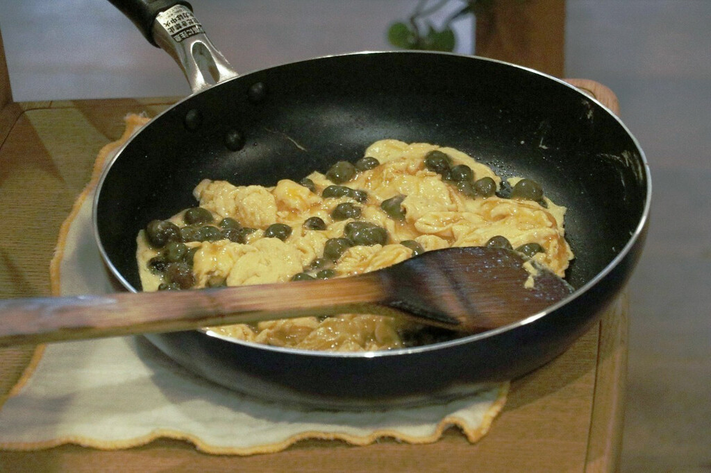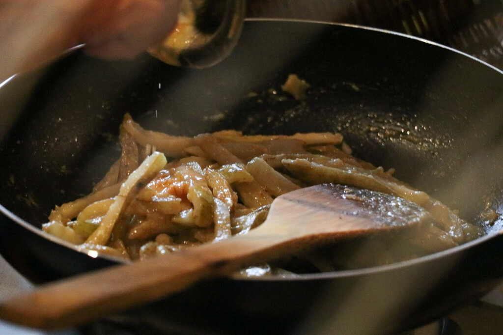 あけびの皮は、ゴーヤのように苦味があります。それを上手に味わうには、下茹でしてから炒めること。油分をきちんと絡めることで、苦味がおだやかになります。味噌は、とろりと水溶きしたものを最後にからめるだけ。