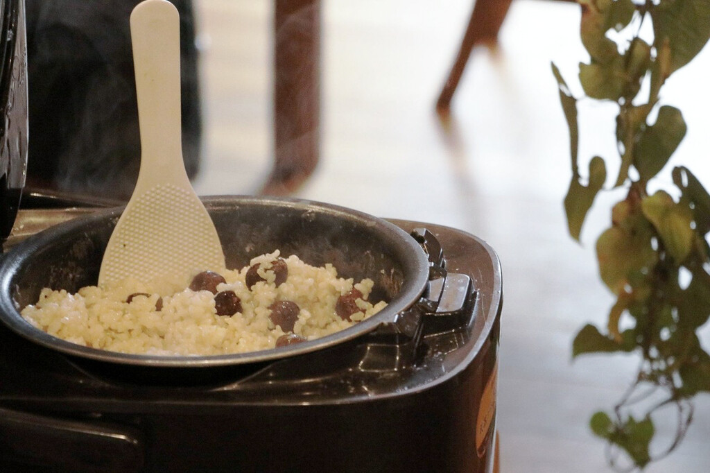 大きめサイズのむかごは炊き込みごはんに。米は玄米です。