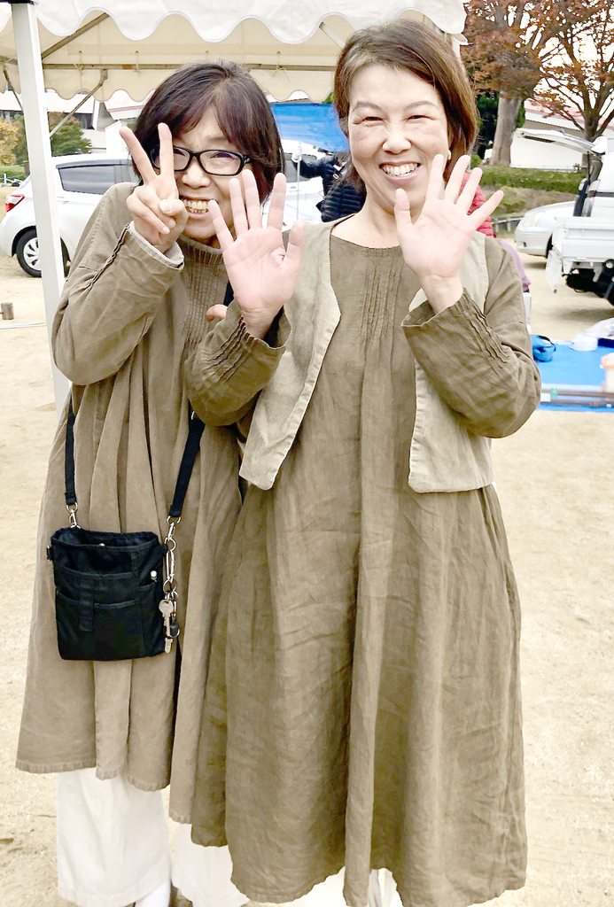 「シガさーん」とハイタッチみたいなことをしていると、なんと、わたしたち、お揃いのコーディネートだったんです(もちろんシガセイサクショウエア)
